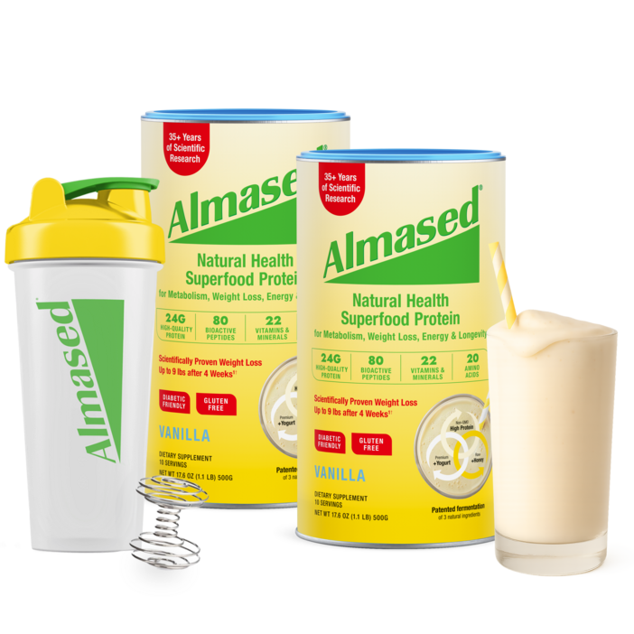 Additionally, Almased helps curb appetite, enhances mood and energy, and supports healthy balanced blood sugar and cholesterol levels, ultimately helping you improve overall health and wellness.